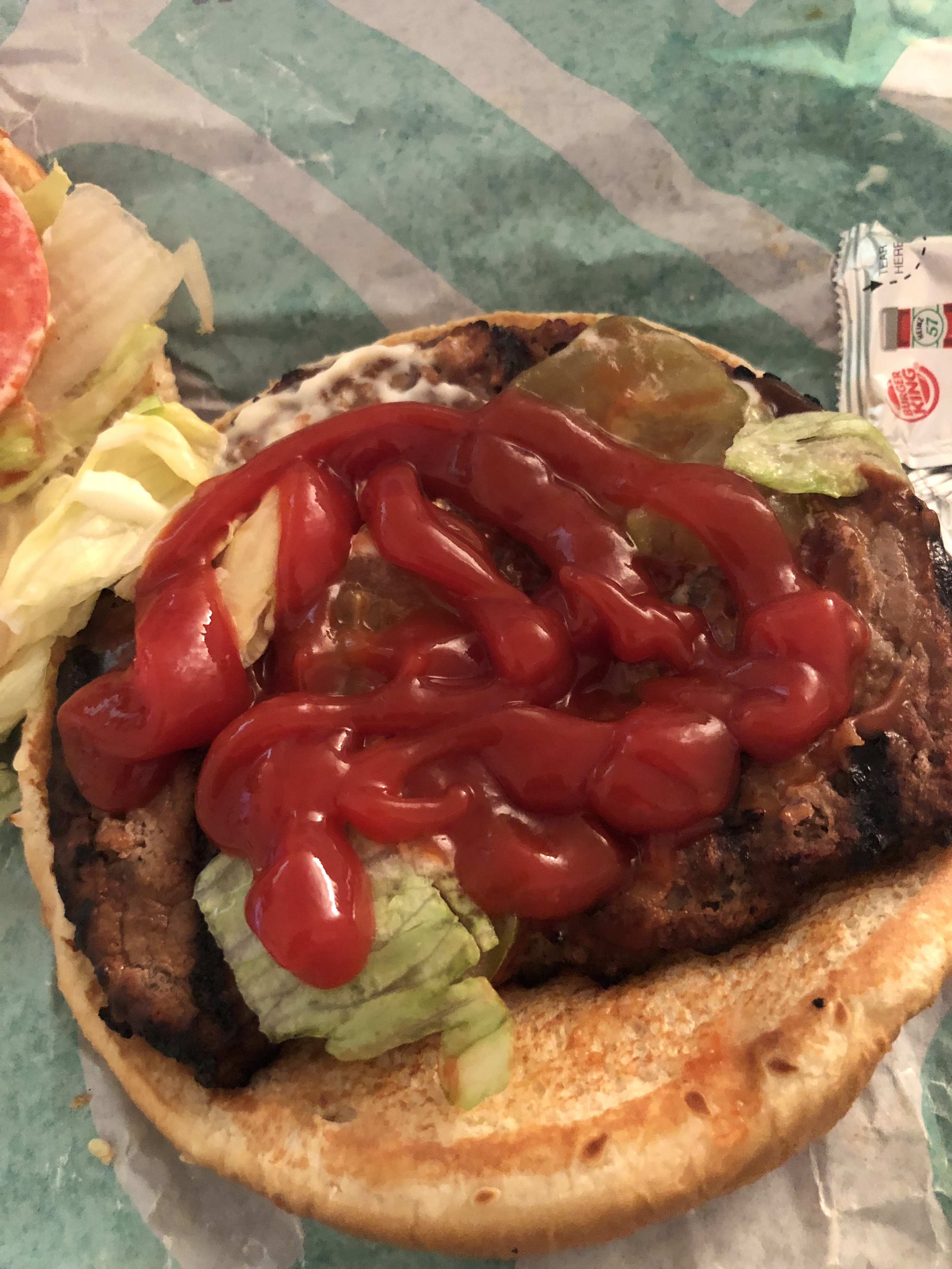 We all know that although the Whooper comes with ketchup, you HAVE TO ADD MORE!!! It’s just something about adding that extra ketchup that sends the sandwich over the top. Or maybe it’s just the fluffy girl in me but this is delicious to me. Okay, so I put the mushed top bun back on the sandwich, give it a quick “smack it up, flip it, and rubbed it down”, who said “Oh nooooooo”? Got to love some BBD!!